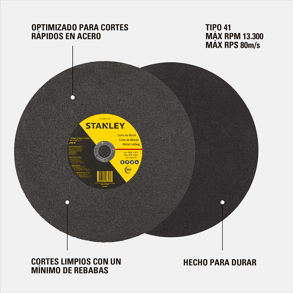El disco abrasivo Stanley STA8011R-LA de 14" está diseñado para cortes precisos y rápidos en...