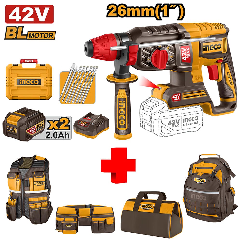 COMBO - INGCO - Rotomartillo de 1" SDS Plus Inalámbrico de 42V con 4 Funciones, 2.5 Joules de 0-5,000 Golpes por Minuto, 0-1,100 Revoluciones por Minuto con 2 Baterías de 2.0 Amperios Brushless con Juego 6 Brocas más 2 Cinceles con Maletín más Kit Portaherramientas