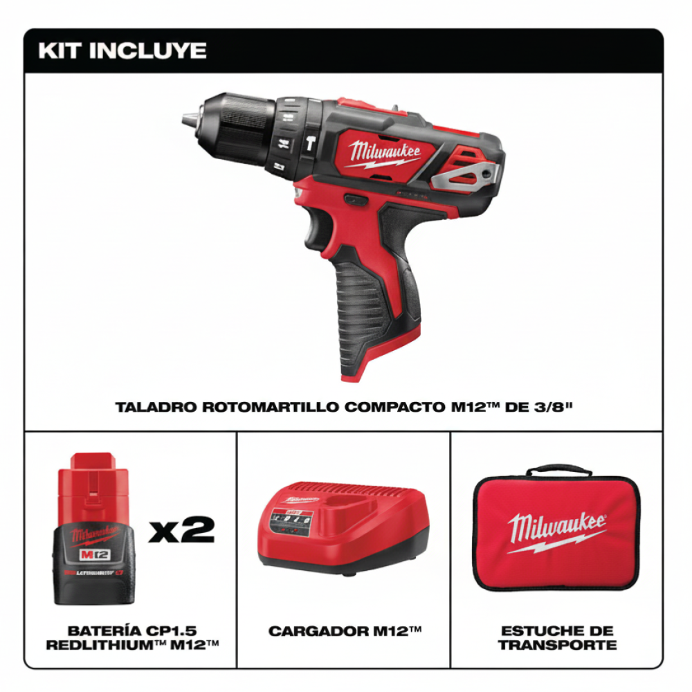 Taladro Martillo 3/8 Inalámbrico 12V con 2 Velocidades Variables de 0 a 400 y 0 a 1,500 Revoluciones por Minuto, Reversible, 0 a 25,500 Golpes por Minuto, sin Llave, Luz Led, 2 Baterías 1.5 Amperios, Cargador y Maletín. MILWAUKEE