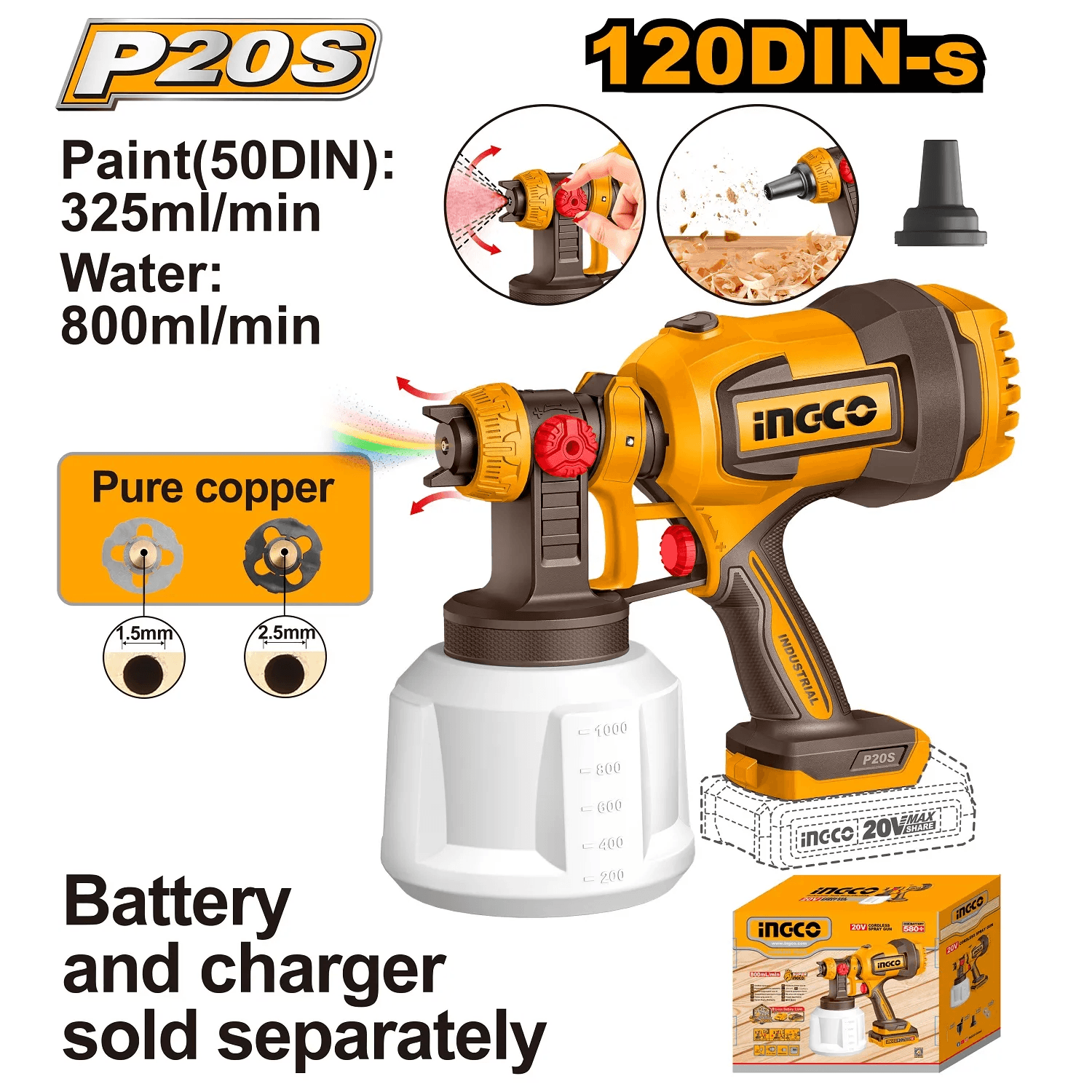 Pistola para Pintar Succión, Inalámbrica de 20V 1.45-2.90PSI 1000ML Flujo Max 800ML/Min sin Batería. INGCO