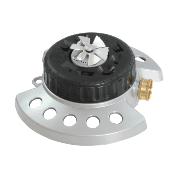 Aspersor torreta multiuso con base metálica estable y acople de latón resistente a la corrosión. Ofrece variedad de patrones de agua mediante un dial fácil de usar, adaptándose a jardines grandes o pequeños, y brindando diversión segura para niños y mascotas.