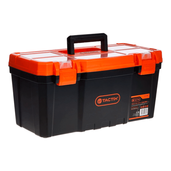 La caja de herramientas plástica Tactix de 19″ esta diseñada para ofrecer almacenamiento resistente y práctico en cualquier entorno de trabajo. Su estructura duradera y su interior bien distribuido permiten organizar herramientas y accesorios con facilidad, mientras que su diseño portátil facilita el transporte diario.