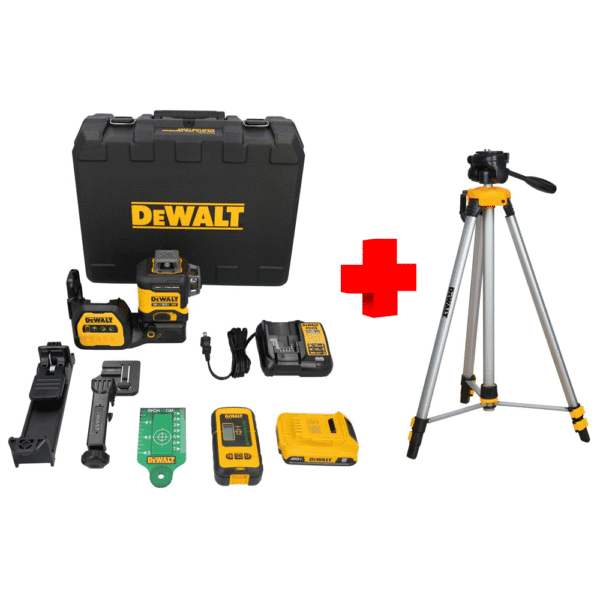 COMBO – DEWALT- Nivel Láser Línea Cruzada Verde de 70MT con 1 Batería de 20V MAX 2 Amperios y Cargador más Trípode de Aluminio de 3′ a 6′ con Rosca de 1/4-20″