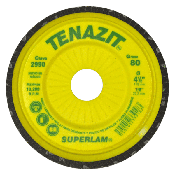 Disco Laminado Respaldo Plástico Superlam para Inoxidable / Acero 4-1/2 X 7/8 #80 Tipo A Zirconio. AUSTROMEX