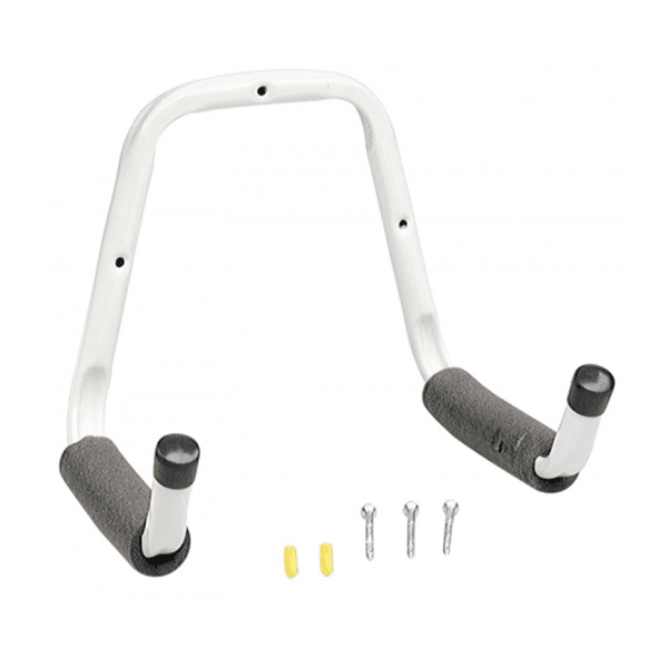 Este gancho para almacenaje de doble brazo está fabricado en acero resistente y cuenta con ganchos de agarre suave para almacenar de forma segura artículos pesados o voluminosos sin rayarlos. Con un límite de carga de 75 lb, es fácil de instalar con la tornillería incluida, pero no debe utilizarse para levantamiento por encima de la cabeza ni exceder el peso máximo permitido.