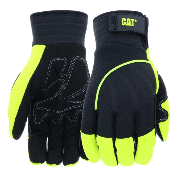 Guante de Mecánico Spandex / Cuero Color Negro y Verde HI-VIS Talla Medium. CAT GLOVES & SAFETY