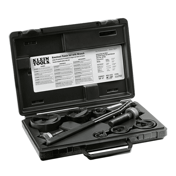 El juego de Ko Punch Klein incluye todo lo necesario para realizar orificios para conductos. El kit perfora de forma limpia y precisa, con una capacidad de corte para acero dulce de calibre 10, aluminio, fibra de vidrio y plástico. Además, divide los residuos de corte (slugs) para facilitar su extracción.