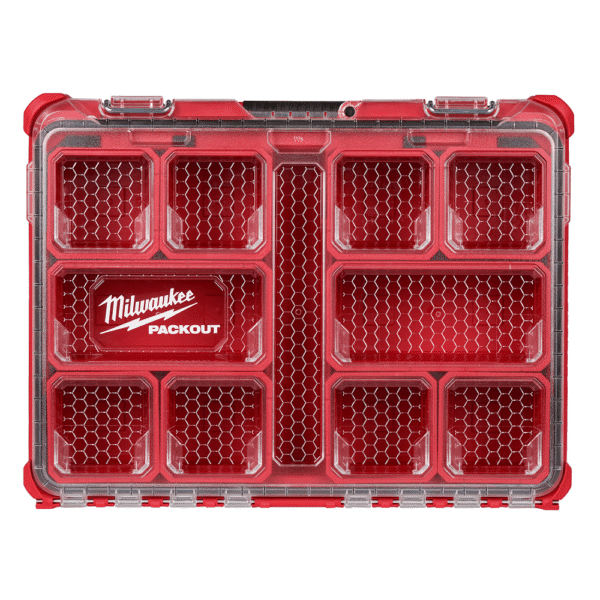 Parte del sistema de almacenamiento modular más versátil y más durable de la industria, el organizador PACKOUT de Milwaukee está construido de materiales resistentes a impactos para tener durabilidad en el lugar de trabajo y cuenta con el sello impermeable con clasificación IP65 para que no entre la lluvia ni los escombros del lugar de trabajo. El interior cuenta con 10 cestas extraíbles que pueden montarse en materiales comunes del lugar de trabajo para tener fácil acceso y sellos de cestas sin desplazamiento para evitar que el contenido de las cestas migren entre cestas durante el transporte.