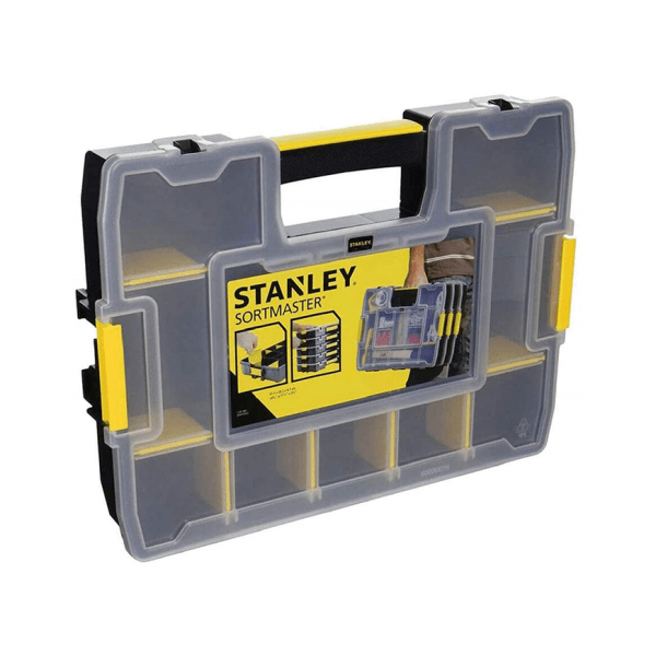 El organizador plástico STANLEY STST14022 es compacto y versátil, ideal para mantener piezas pequeñas y herramientas manuales en orden. Su diseño apilable con cierres de bloqueo permite transportar hasta tres unidades a la vez, mientras que los divisores removibles y la tapa con estructura especial evitan que los objetos se mezclen entre compartimentos.