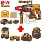 Rotomartillo de 1″ SDS Plus Inalámbrico de 42V con 4 Funciones, 2.5 Joules de 0-5,000 Golpes por Minuto, 0-1,100 Revoluciones por Minuto con 2 Baterías de 2.0 Amperios con Juego 6 Brocas más 2 Cinceles con Maletín. INGCO