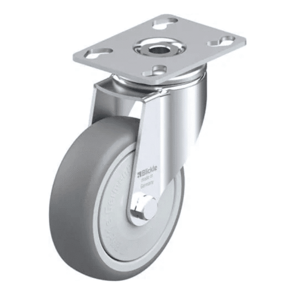 Rueda de 4″ Giratoria Inoxidable Con Freno Caucho Elástico 100 X 32MM 200KG con Rodamiento Bola A.Hilo. BLICKLE