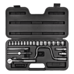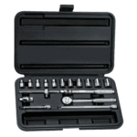 El juego de socket corto de 6 a 22 mm con encastre de 3/8, vienen con el sistema MaxiDrive de puntas redondeadas ofreciendo 15% mas torque y evita el redondeo de las puntas de las tuercas, además son fabricados con acero cromo vanadio lo cual permite tener un producto seguro al igual que los ratchets y sus accesorios. Ademas cumplen y exceden las normas ANSI y DIN lo cual ha permitido que sean utilizada en industria.