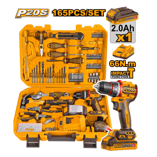 El taladro martillo inalámbrico y set de herramientas de 165 piezas de INGCO ofrece una solución completa y versátil para trabajos de mantenimiento, instalación, reparación y bricolaje. Incluye un taladro martillo inalámbrico de 20 V junto con una amplia variedad de herramientas manuales, brocas, puntas y accesorios organizados en un práctico maletín. Diseñado para profesionales y usuarios domésticos que buscan funcionalidad, portabilidad y rendimiento en un solo paquete.